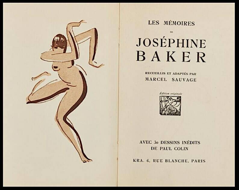 Les Mémoires de Joséphine Baker recueillis et adaptés par Marcel Sauvage. Paris, Kra, 1927. In-4. illustré de 30 dessins de Paul Colin dont la couverture.