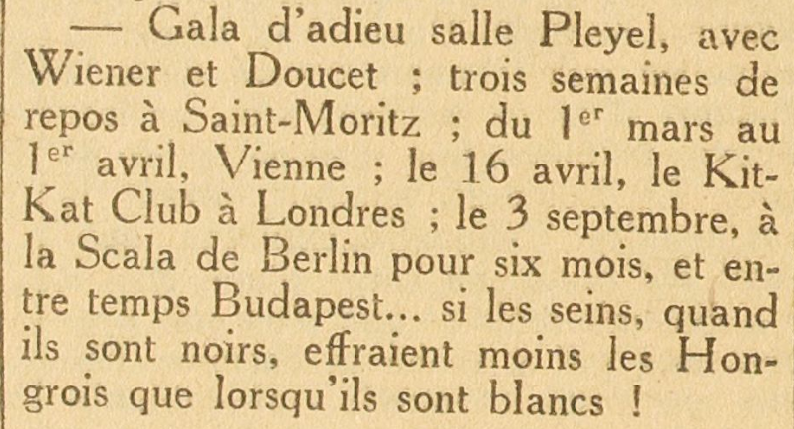 Nouveau spectacle aux Folies Bergère. J. B. troque sa ceinture de plumes contre une mythique jupe de bananes...