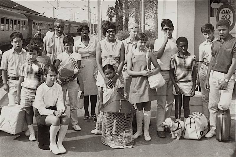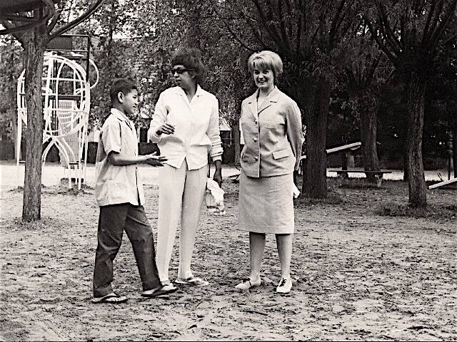 Dans le jardin de l'hôtel-restaurant Marie Siska (Moeder Siska), à Knokke-Heist, sur la côte belge, avec un de ses enfants et l'hôtesse Georgette. Véritable institution de la côte belge, les gaufres de cet établissement attirèrent de nombreuses personnalités. Sans doute la tribu Arc-en-Ciel en fut-elle friande…