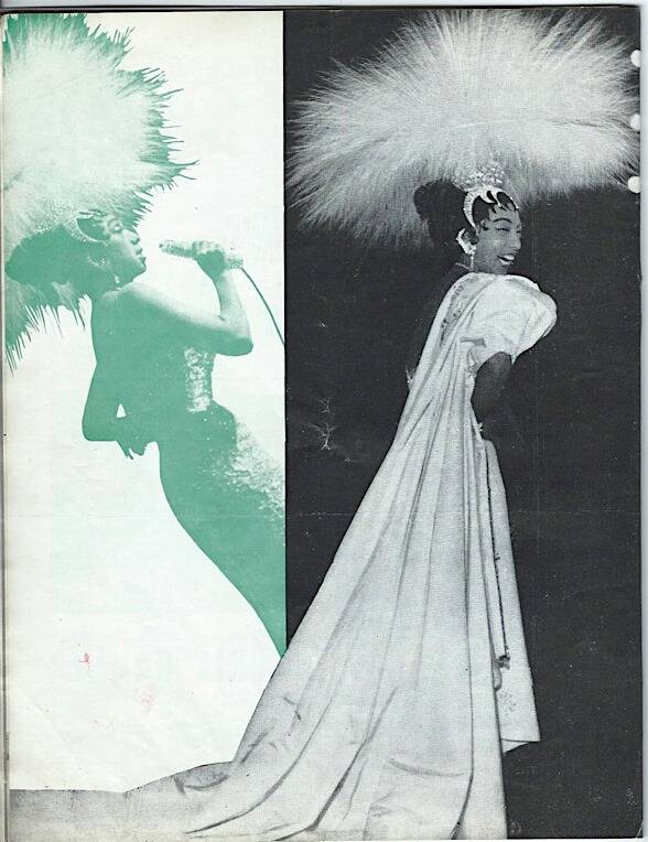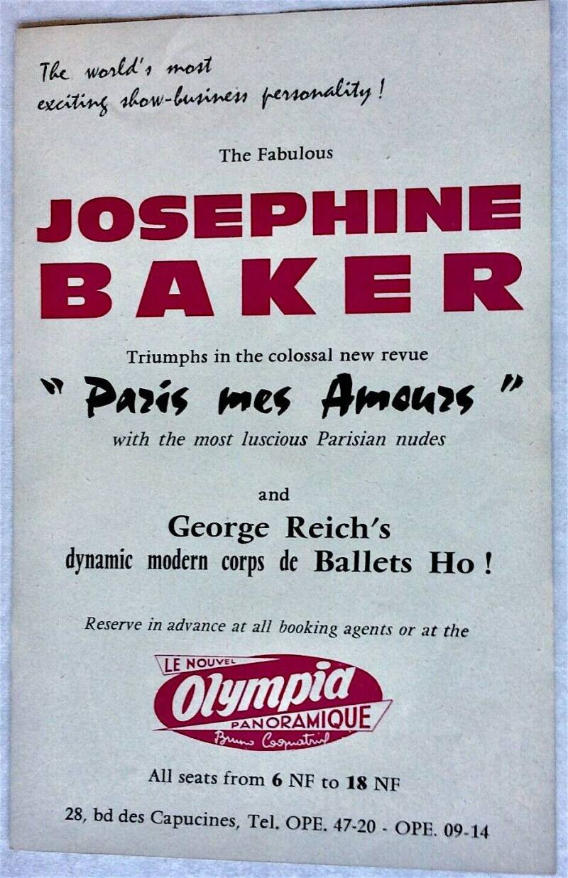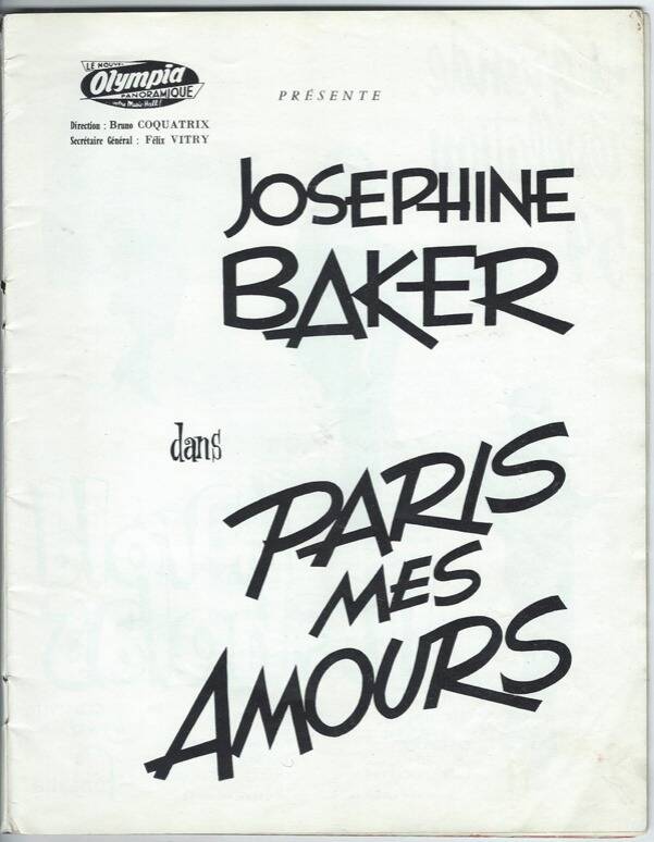 « En 1959, J. B. remonte sur scène à l'Olympia en vedette de la revue "Paris mes amours". Une partie de la presse ironise sur ces nouveaux adieux trois ans après les premiers. Mais le public se rue sur les billets dès leur mise en vente. La trame du scénario de la revue est l'évocation chronologique de sa carrière, de la Revue Nègre à la guerre en passant par les Folies Bergère et le Casino de Paris. La première a lieu le 27 mai 1959, le public fait une standing ovation à Joséphine Baker. Les représentations se poursuivront, à guichet fermé, jusqu'au 17 janvier 1960. » (Source :https://fifties-vintage.skyrock.com/2713085830-5-6...).