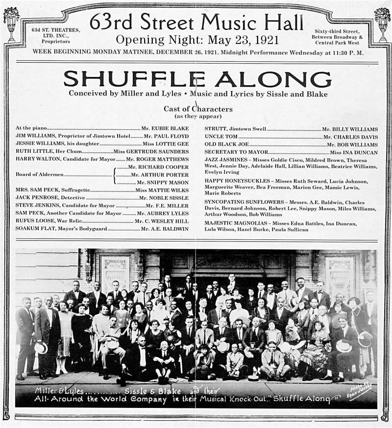 Premier spectacle musical composé et interprété par des Noirs américains, Shuffle Along fut joué pendant deux semaines, fin mars 1921, au Howard Theatre, de Washington, avant de s'installer au 63rd Street Music Hall, de New York, le 23 mai 1921. 504 représentations en furent données ! Un accueil inattendu !