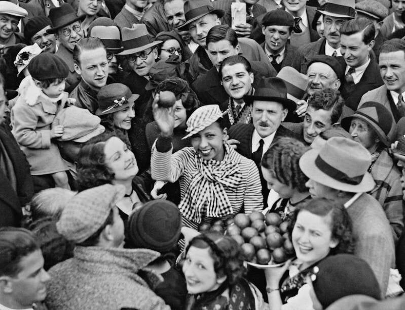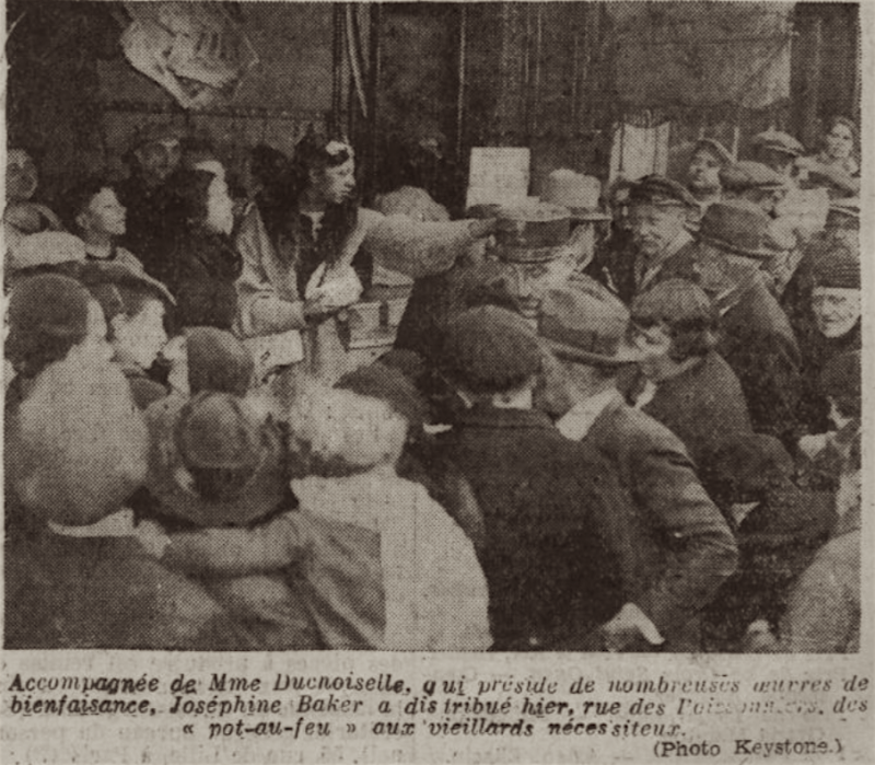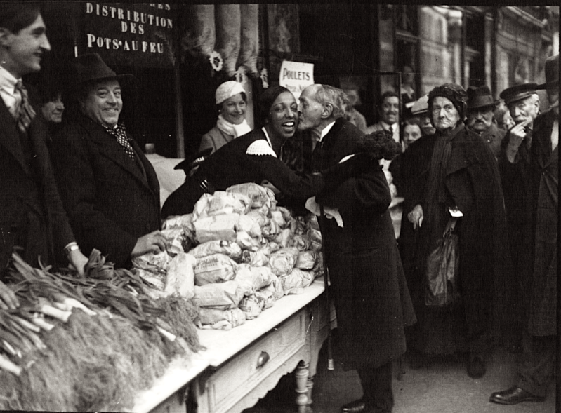 Josephine Baker faisant la quête aux Halles pour le Pot-au-Feu des Vieux, 1936.