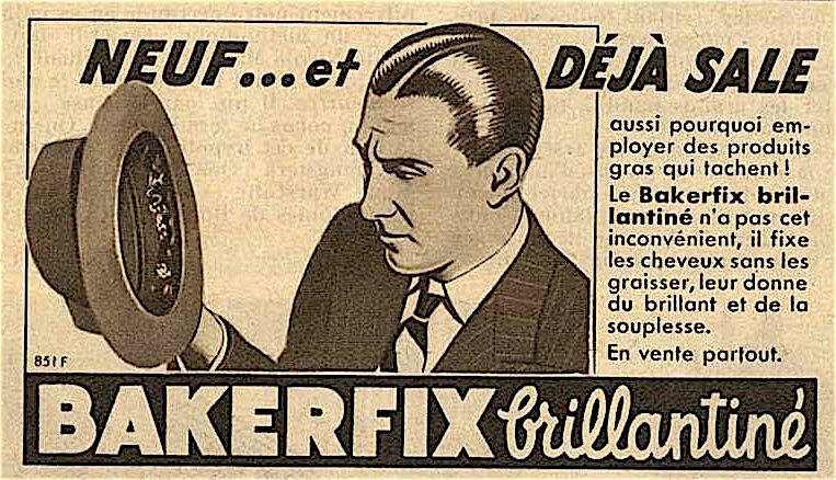 « Chez les coiffeurs, dans les années 1930, des affiches recommandent la brillantine Bakerfix. Sur l’emballage, il est précisé que le produit " fixe les cheveux sans les graisser ”. On en déduit donc qu’il ne s’agit pas d’une brillantine (celle-ci étant constituée de corps gras et ayant pour but de rendre les cheveux souples et brillants), mais bien plutôt d’une bandoline (cosmétique fixatif des cheveux). Le produit est commercialisé dans un joli pot en verre, agrémenté d’une représentation de l’artiste, cheveux noirs plaqués à l’aide dudit produit. Une frise représentant l’artiste en tenue de music-hall (nue avec une ceinture de bananes stylisée) vient compléter le tableau. Du point de vue de sa composition, il s’agit d’un gel de gomme adragante généreusement parfumé (40 grammes de gomme adragante, 990 grammes d’eau distillée, 10 grammes de glycérine, 3 grammes de soluté de formol, 1,5 grammes d’ionone blanche pure, 1 gramme de zeste de bergamote, 0,20 gramme d’essence d’Ylang Ylang de Madagascar, 0,05 gramme d’essence absolue liquide de jasmin). » [https://www.regard-sur-les-cosmetiques.fr/nos-regards/josephine-baker-chanteuse-et-icone-cosmetique-157/]
