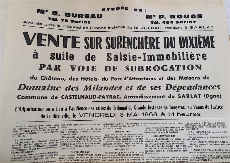 « Statuant sur une instance en référé engagée par la société en commandite simple Jo Bouillon et Cie. invoquant, avec l'assistance de Me Dunoyer, un bail sur les locaux commerciaux du domaine des Milandes (restaurant, magasin de souvenirs et musée), d'où a été chassée Joséphine Baker, avec sa famille adoptive, le tribunal de Bergerac s'est déclaré incompétent, renvoyant la société demanderesse à se pourvoir, si elle le désire, devant les juges du fond.