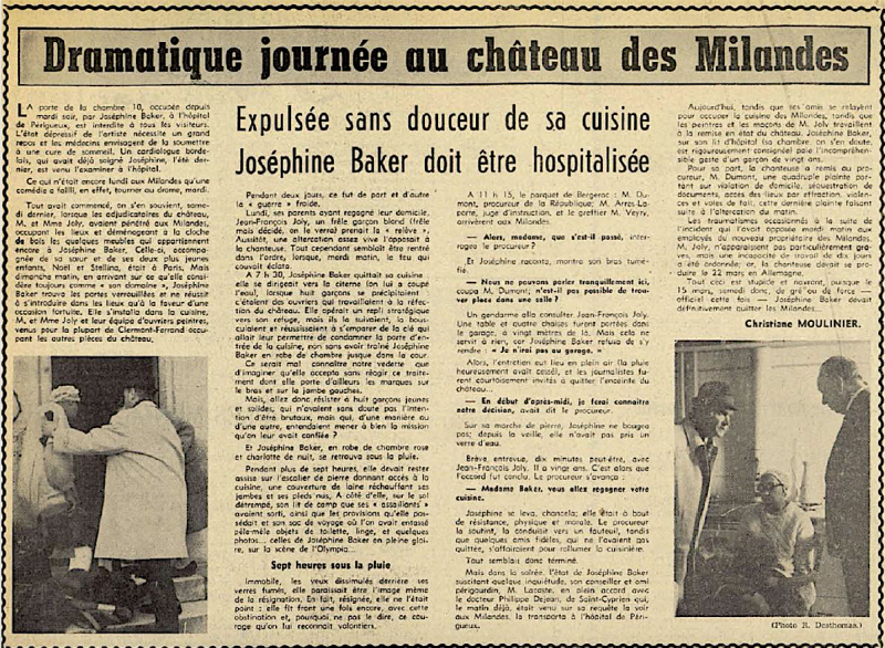 « Mme Joséphine Baker va-t-elle soutenir un siège aux Milandes ? Vendredi, la vedette quittait le château pour le week-end et se rendait à Paris. Samedi, les trois acquéreurs des biens immobiliers constituant l'ensemble du domaine, vendu aux enchères le 3 mars dernier, prenaient possession des lieux. Dimanche, l'actrice revenait au château et, malgré l'opposition des nouveaux propriétaires, réussissait à pénétrer dans le parc puis à se " barricader " dans une cuisine.
