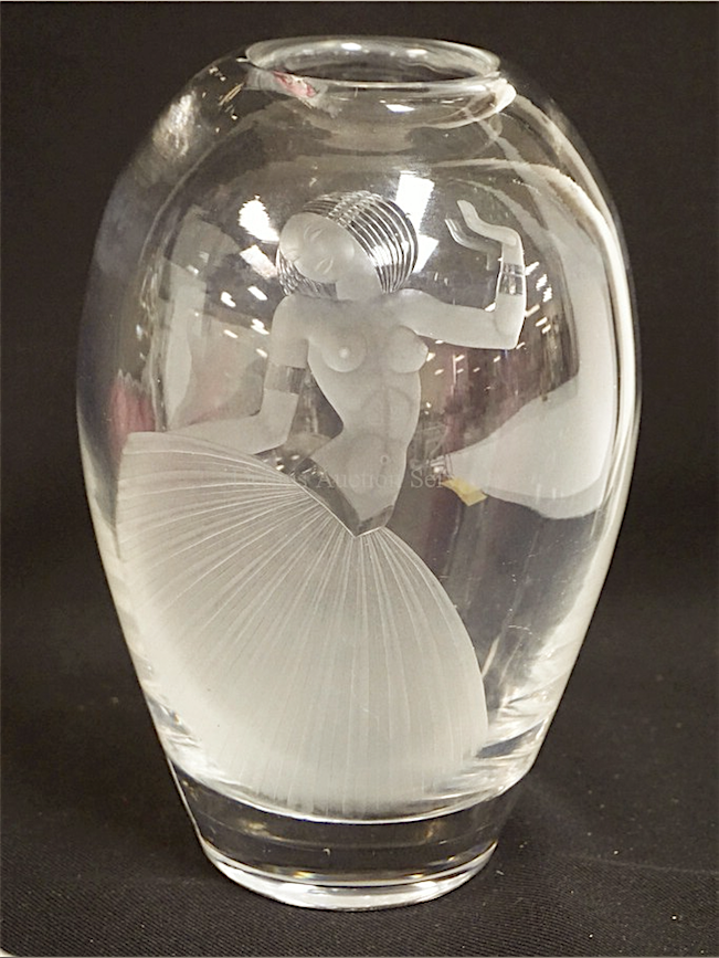 A gauche : vase en cristal, signé Lindstrand et gravé de l'image de J. B., vers 1930. A droite : vase dessiné par Simon Gate, 1941.